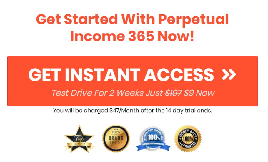 For a limited time, Perpetual Income 365 is offered as a test drive for 2 weeks for $9. After that you will be paying $47 a month which actually isn't that bad considering everything you get with this program. The best part is you can try it out for 60 days and if you don't make any sales then you can request a refund.